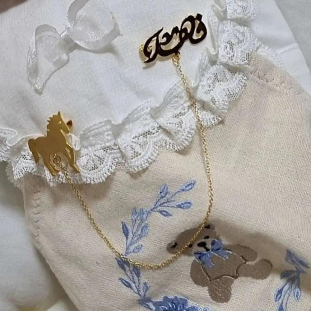 اسم طفلك في بروش انيق و فخمنوفره لكم في لمسه مميزة تضفي على طفلكمزيد من الأناقةيمكن كتابة الاسم بالخط المطلوبمتوفر باللونين ذهبي او فضيياتيك بتغليف شيك وجمييل