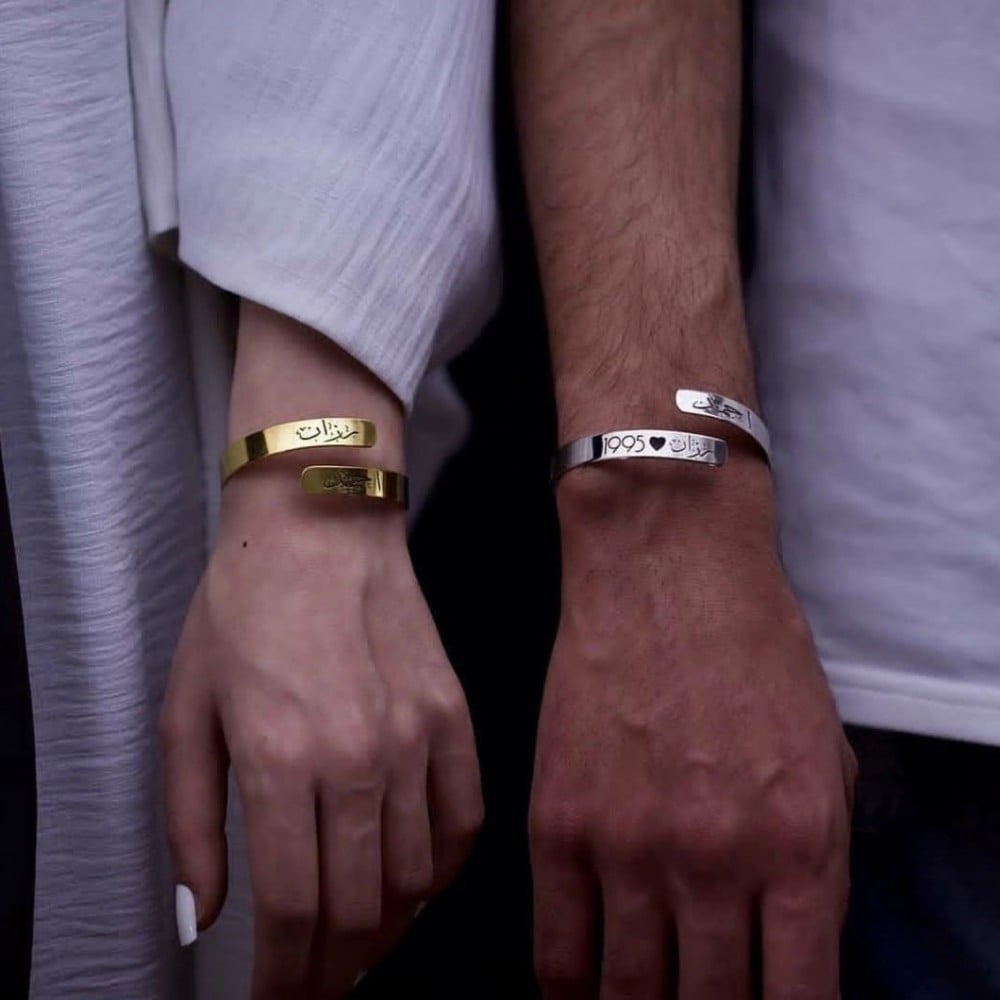 تفاصيل المنتج:مطلي ذهب او فضة.متوفر اللون ذهبي او فضي حسب رغبتك.الخط بلون اسودصيانه مجانيه 100%مقاس الاسورة وسط وبأماكنك التحكم في المقاس تضييقه او توسيعه.نكتب على الاسورة حسب الطلب.موقعنا الرياض ونوصل لجميع مدن المملكة
