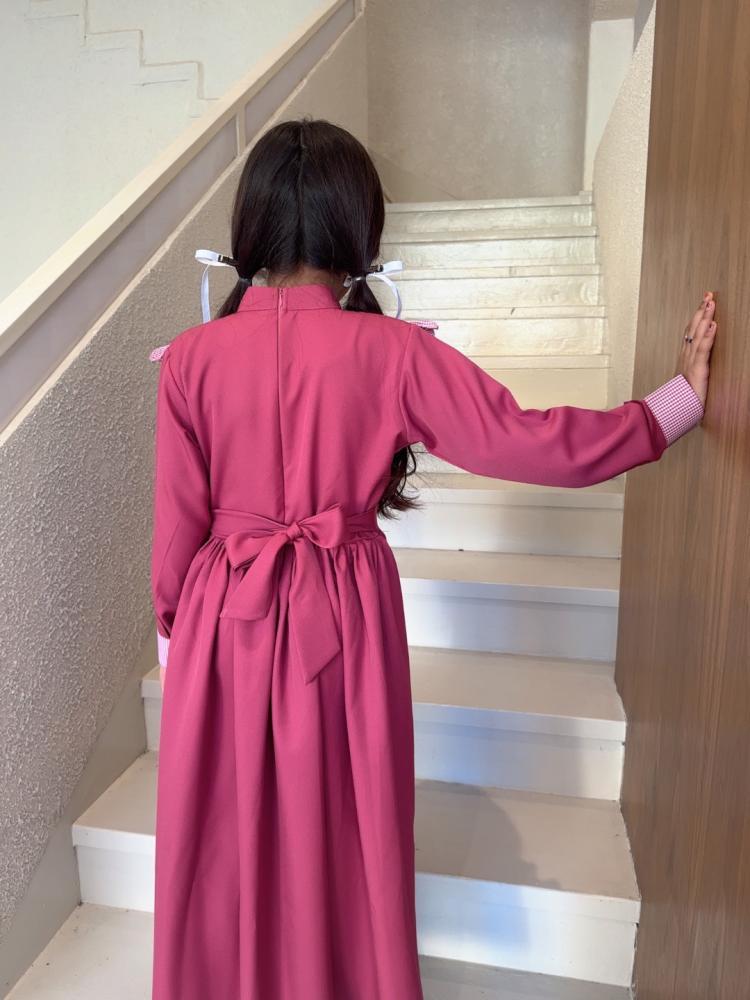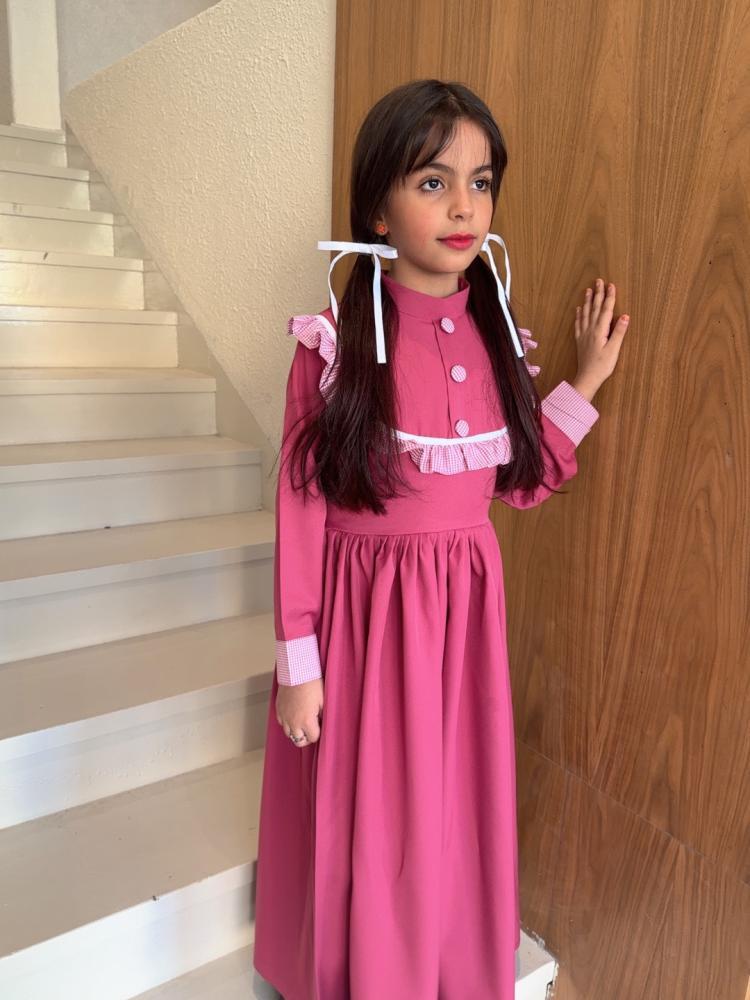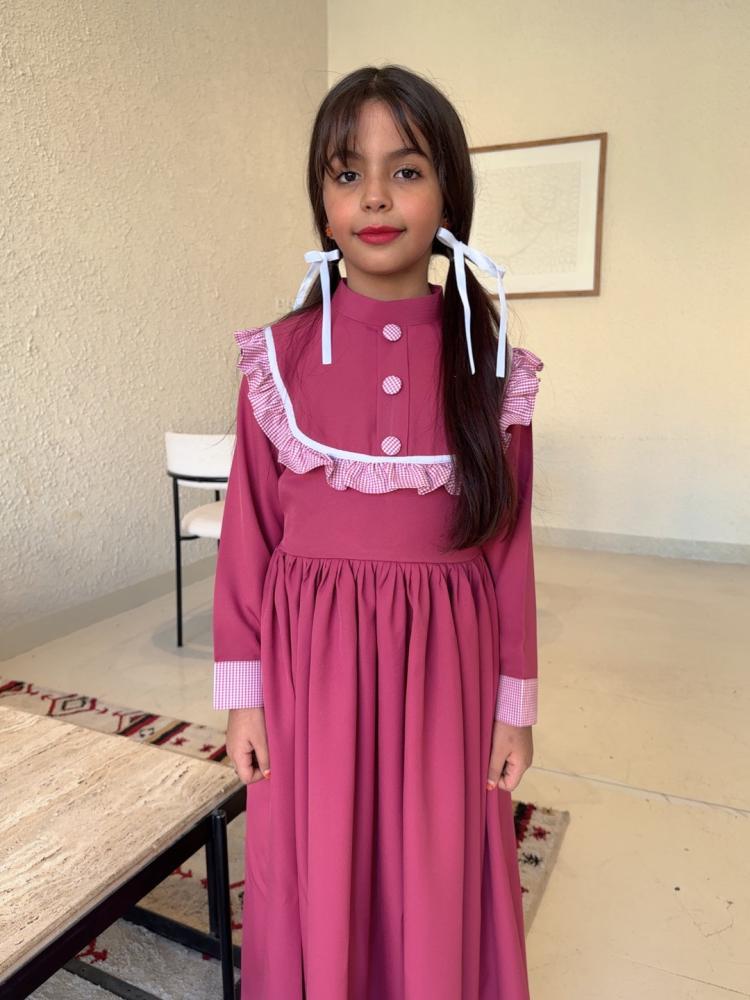 مزينه بأزارير مع قصه صدر دائرية بكشكشه كاروهات ومعصم الاكمام